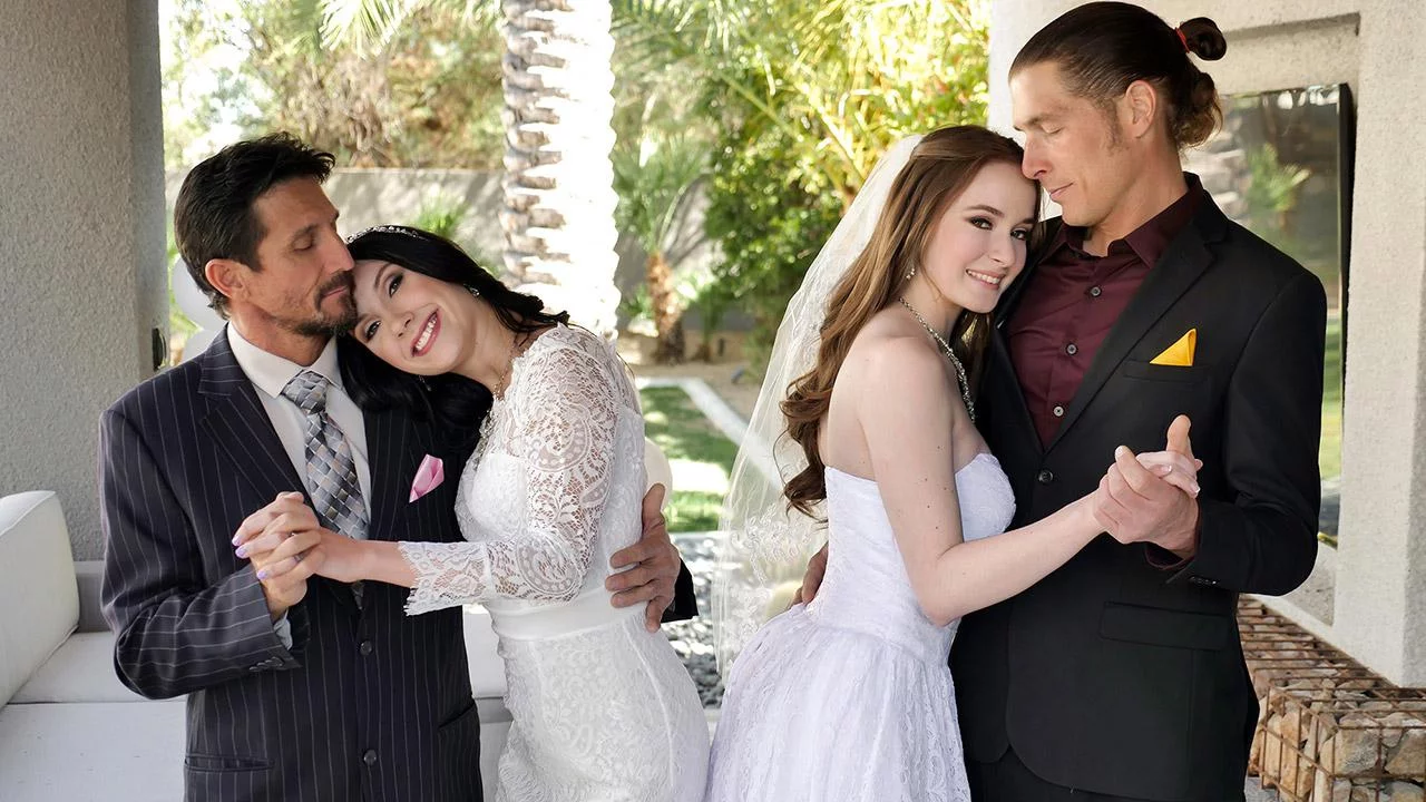 Alluring brides Hazel Moore and Jazmin Luv are a little nervous about getting married, especially since they have never had sex before. The virgin babes need to know what it feels like to have a thick cock inside their cunts before they walk down the aisle, so they ask their stepdads to show them the ropes. They swap pops and a pre-wedding de-flowering orgy ensues. Hazel leaves her girdle on while she gets slammed doggystyle, and Jazmin squeezes her tits and enjoys a veiny stepdad dick in her sweet vag. To top off the passion, the guys fill each other’s daughters with dripping creampies. Time to get married, girls!