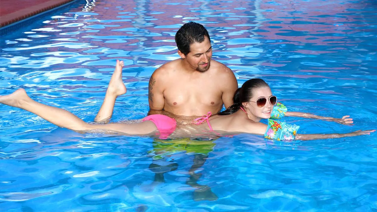 Carolina has wanted to learn how to swim forever! Shes so small that she can usually just float but she has really been interested in the sport of it. She was lucky enough to book a world class swim trainer. On her first lesson, he sets her up with some cute little floaties just in case she makes a wrong move. Shes getting the hang of it, but isnt too much fun. She would rather be playing with the bottle of sunscreen her trainer is hiding in his pants AKA his dick. His cock towers over hershe sucked it gracefully in the water. Then they paddle over to the shallow end so he can penetrate her tight yet deep little cunt. After Carolina gets wetter then the water, her trainer pulls her out to spray her face with his prized seed. Carolina may not be a shoe in for the next Olympic swimming race, but she sure knows how to take a creamy loada champion!